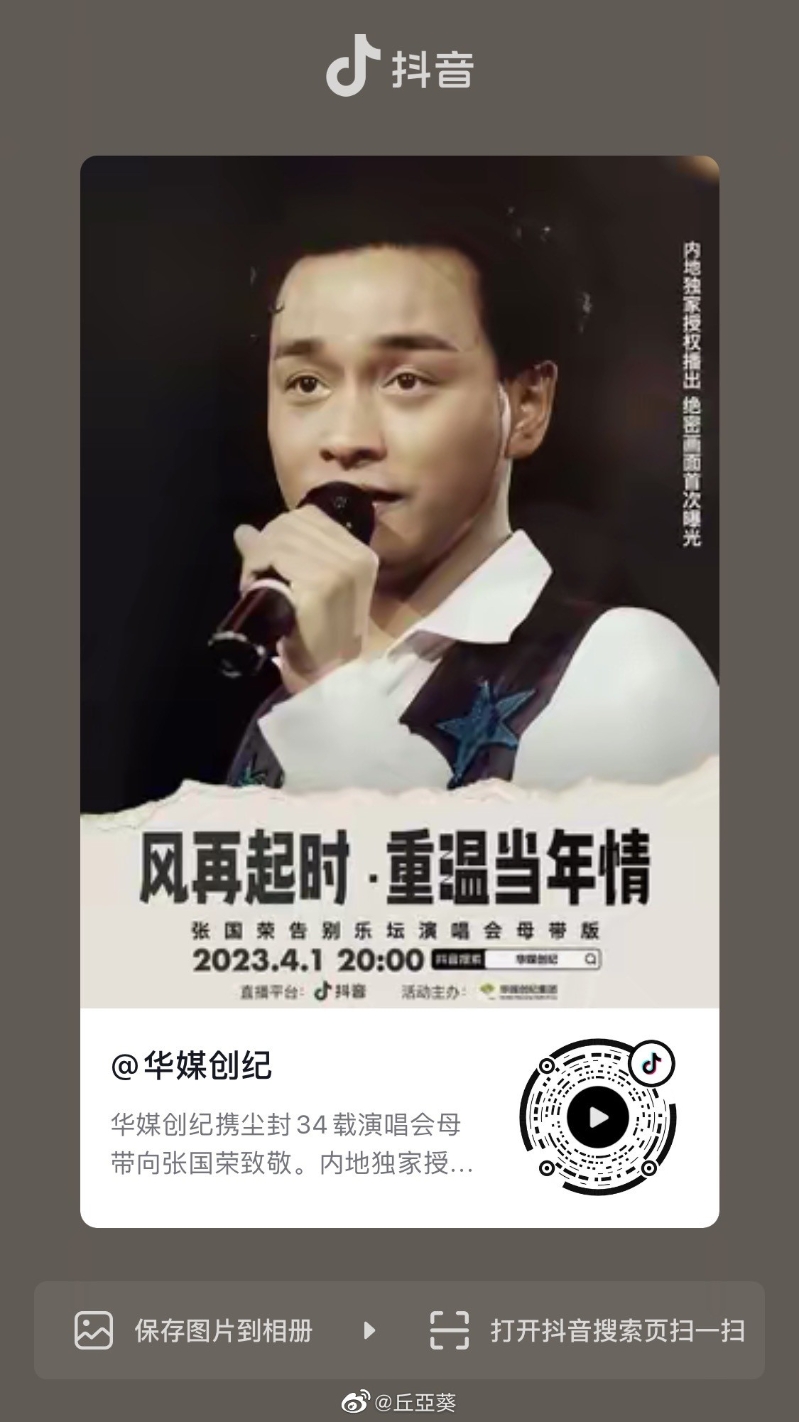 抖音明直播張國榮告別演唱會 。丘亞葵微博圖片 丘亞葵日前表示,知悉抖音方面有意為哥哥製作紀念節目,但由於涉及版權問題,必須取得版權持有人許可才能成事。自己千方百計透過多種渠道,最終成功聯絡到相關版權人,經過3次商協終於簽成合約,成為內地唯一版權公司與抖音合作。 他又說,89年告別音樂會至今已過了30多年,自己特意飛往上海找到公司翻新母帶,發現母帶內尚存了很多哥哥的珍貴畫面和生活點滴,包括與歌迷互動、紅館化妝間內自己動手化妝、拜神等。丘亞葵續說,很多畫面都是首次曝光,自己看到了亦非常感動,故一併收錄在該特輯中。團隊工作人員亦日以繼夜趕工製作,全力重新包裝。