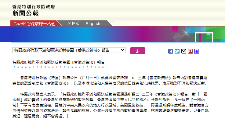美國發表香港政策法報告 港府表強烈不滿:信口雌黃香港新聞網4月1日電 4日1日淩晨,香港特區政府發表新聞公報,就美國發表的2023年《香港政策法》報告內對香港落實經完善的選舉制度和《香港國安法》以及香港法治和人權等情況的污衊抹黑,表示強烈不滿和堅決反對。