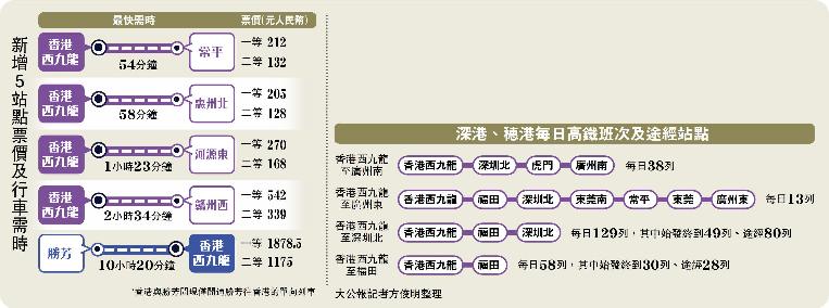 西九今起重啟跨省高鐵 灣區一小時生活圈更緊密香港新聞網4月1日電 4月1日零時起,全國鐵路啟用新的列車運行圖,廣深港高鐵香港段的長途服務全面恢復,所有站點全面重開,接通香港與廣東省以外的長途站點,並增加5個新站點,包括常平、惠州北、河源東、贛州西及勝芳。至此,香港西九龍站通過高鐵與內地66站點相連。 廣鐵透露,新的列車運行圖大幅提升了往返深港、穗港兩地的高鐵運能,其中廣州南站往返香港西九龍站的列車由每天的28列增至38列,昇幅35%。而深圳北站、福田站開行跨境高鐵列車數較之前大增60列,促使香港與深圳、廣州更緊密地融入“粵港澳大灣區一小時生活圈”。