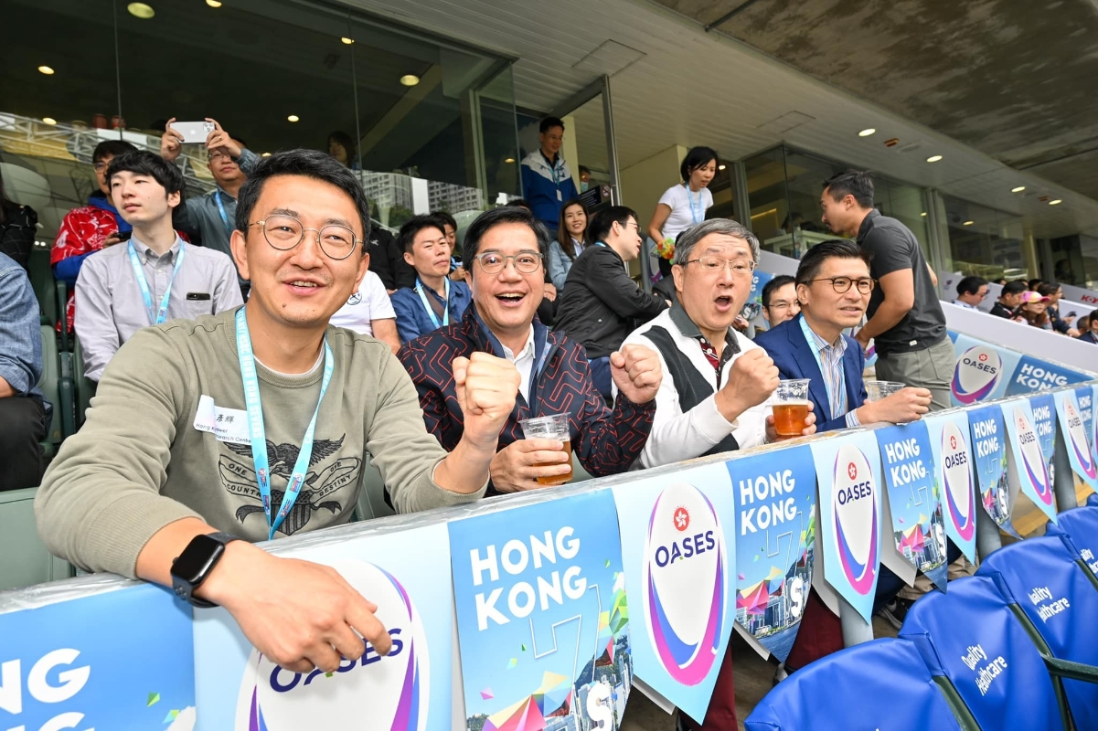 黃偉綸(左二)及卓永興(左三)到場觀賽,邊喝啤酒邊為港隊打氣。(FB圖片) 當天,黃偉綸在社交媒體發文表示,這屆香港七欖的入場觀眾不用顧忌防疫限制,可以盡情享受賽事,場內人潮湧湧,很多市民悉心打扮,盡情投入狂歡的熱鬧氣氛。香港近日舉辦多項盛事,例如巴塞爾藝術展、國際都會高爾夫球錦標賽、“裕澤香江”高峰論壇、博物館高峰論壇等,展現出香港獨有魅力及活力。 黃偉綸指出,近日,世界各地的朋友和旅客來到香港,除了逛旅遊名勝,享受美食文化新體驗,也來港發掘更多經商合作的新機遇。特區政府會繼續加強對外宣傳,說好香港故事,也歡迎市民積極參與。(完) 【編輯:李冉】