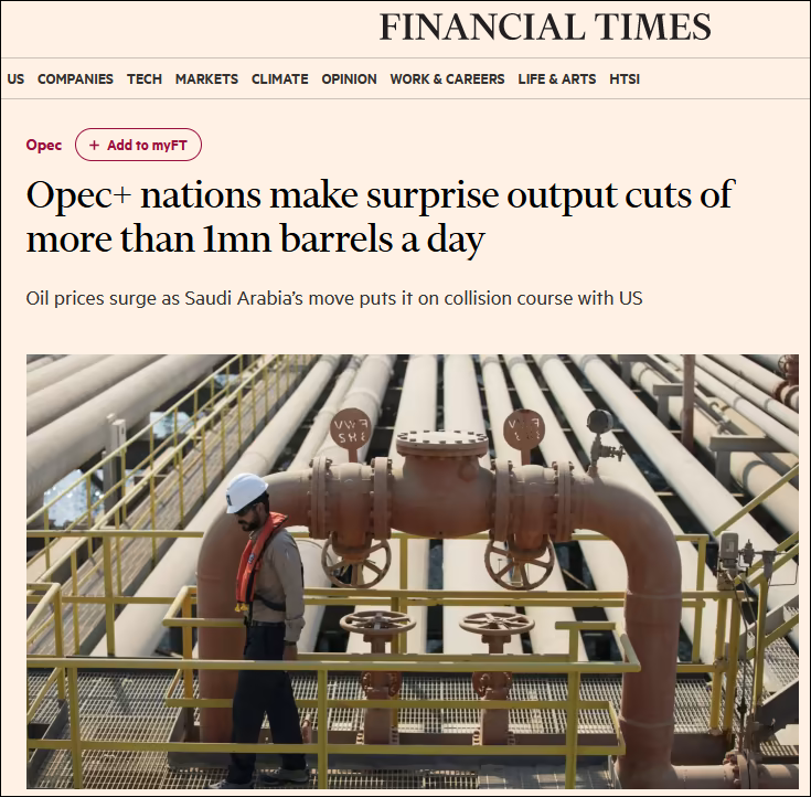 英國《金融時報》報道截圖 沙特方面表示,此次主動減產將從5月開始持續至今年年底,減產是出於“經濟因素考量”,為求穩定石油市場,并不含有政治因素。英國《金融時報》分析認為,此次沙特領頭的減產動作“不同尋常”,由於當前銀行業危機和原油需求低迷,油價下跌給產油國帶來壓力。而去年10月,OPEC+自新冠疫情以來最大幅度減產已導致了與美國的矛盾,此次減產更可能重新導致沙美之間的爭端。 消息人士披露,由於此前美國承諾,如果油價下跌將購入沙特的戰略儲備石油,但白宮上周卻突然改口,這讓沙特非常惱火,沙特或正在制定獨立於美國的經濟戰略。高盛集團分析師則在一份報告中指出:“與過去相比OPEC+擁有非常大的定價權,意外減產符合該組織先發制人的新原則。”(完) 【編輯:王軼南】