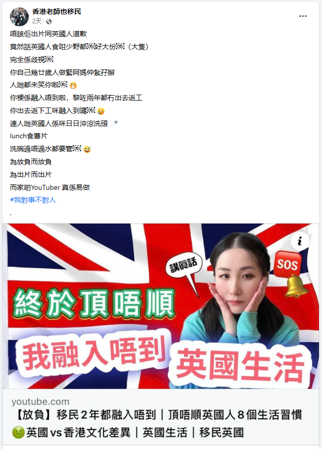 臉書截圖 該 “黃絲”斷言“Moon媽在英生活”之所以融入不了英國社會是因為兩年沒有出去工作。對於她提到的文化差異,該“黃絲”十分激動地替英國人打抱不平,認為“Moon媽在英生活”對英國人飲食習慣的評價“完全是歧視”,應為此“向英國人道歉”。又批評“Moon媽在英生活”多事,連英國人洗澡頻率、午餐吃薯片等都要管。 “為放負(傳播負能量)而放負,為出片而出片。”該“黃絲”又質疑港人博主是為博眼球才這麼說,“刻薄”地說“現在的YouTuber真好做”。 當初,不少“黃絲”港人聲稱是為“民主自由人權”才移英,豈料到了西方社會,這些人又容不下真正“民主”的聲音了…… “Moon媽在英生活”吐真言遭“手足”圍剿的這出鬧劇,很快也引來不少香港網友圍觀。在相關消息的評論區,有網友指出,發文批評“Moon媽在英生活”的“手足”其實也曾抱怨過移英生活,如今見到他人表達類似的觀點卻又不樂意了,認為“手足”言論不過是“五十步笑百步”,既然“都是白卡(原指殘疾人登記證,後被用作嘲諷行為怪異的人)”,不如握手言和。
