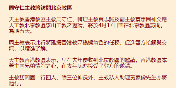 天主教港區主教訪北京的三重橋樑角色香港中通社4月4日電(記者 陳卓儀)天主教香港教區主教周守仁本月將訪問北京,這是香港回歸以來,首位教區在任主教訪問北京。香港宗教研究學者分析,本次行程將進一步促進中國與梵蒂岡簽訂的臨時協議,也會促進香港與內地宗教互動。 據天主教香港教區發布的聲明,周守仁主教應北京教區李山主教去年的邀請,將於4月17日前往北京教區訪問,為期5天。