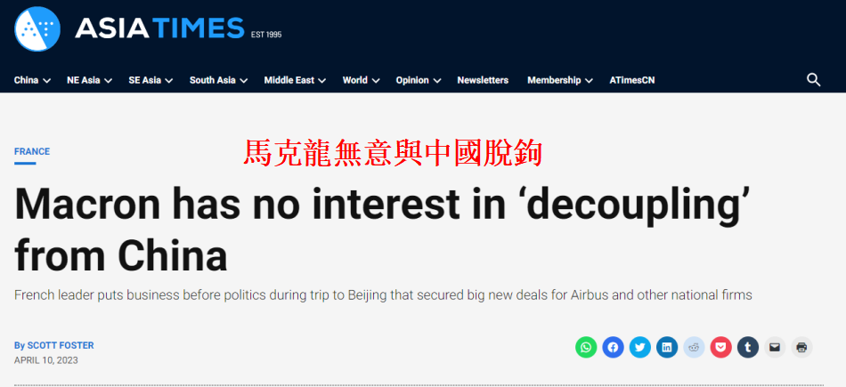 香港《亞洲時報》報道截圖 文章稱,法國總統馬克龍最近對中國進行了國事訪問,但其因未能在俄烏停戰問題上取得進展而受到了“嚴厲批評”。然而,這并不是馬克龍訪華的真正重點。 馬克龍此次備受矚目的訪華之行達成了擴大空客以及其他法國公司在中國業務的協議。這是法國經濟及其獨立外交的重大進展,也是波音和美國試圖“遏制中國”的重大挫折。 法國飛機製造商空中客車公司(以下簡稱為“空客”)首席執行官紀堯姆·福里是馬克龍隨行的約60名法國高管之一。福里與天津保稅區投資有限公司和中國航空工業集團有限公司簽署了協議,在空客天津建設第二條生產線以拓展A320系列飛機的總裝能力。簽約儀式於4月6日舉行,由中法兩國元首共同見證。 截至2023年3月,中國在役的空客飛機數量超過2100架,占全國機隊總數的50%以上。