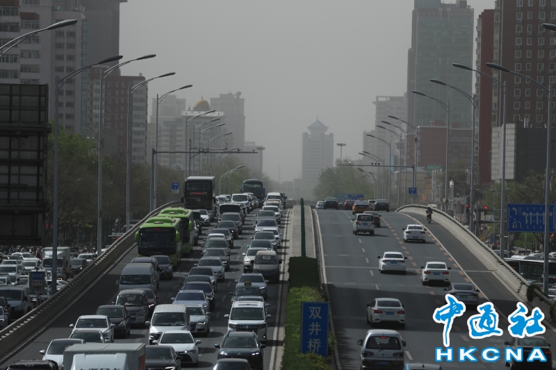 •   4月11日,北京遭遇大風和沙塵天氣,建築被沙塵籠罩。北京市氣象台於10日20時升級發布了大風黃色和沙塵暴黃色預警信號。 香港中通社圖片