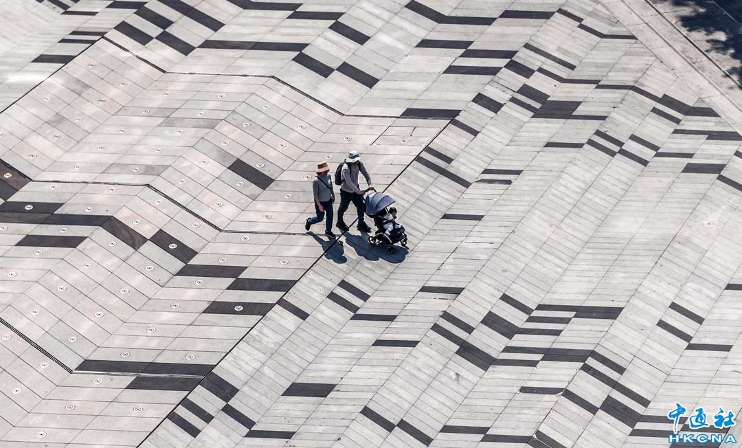 4月4日,重慶南濱路現“立體”人行道,吸引市民打卡。據了解,該人行道通過不同顔色地磚交叉鋪設的方式,形成了3D立體效果。當人們俯視時便能看到“立體”的人行道,而行人走在上面卻和平路一樣。圖為市民帶著孩子行走在“立體”人行道上。香港中通社圖片