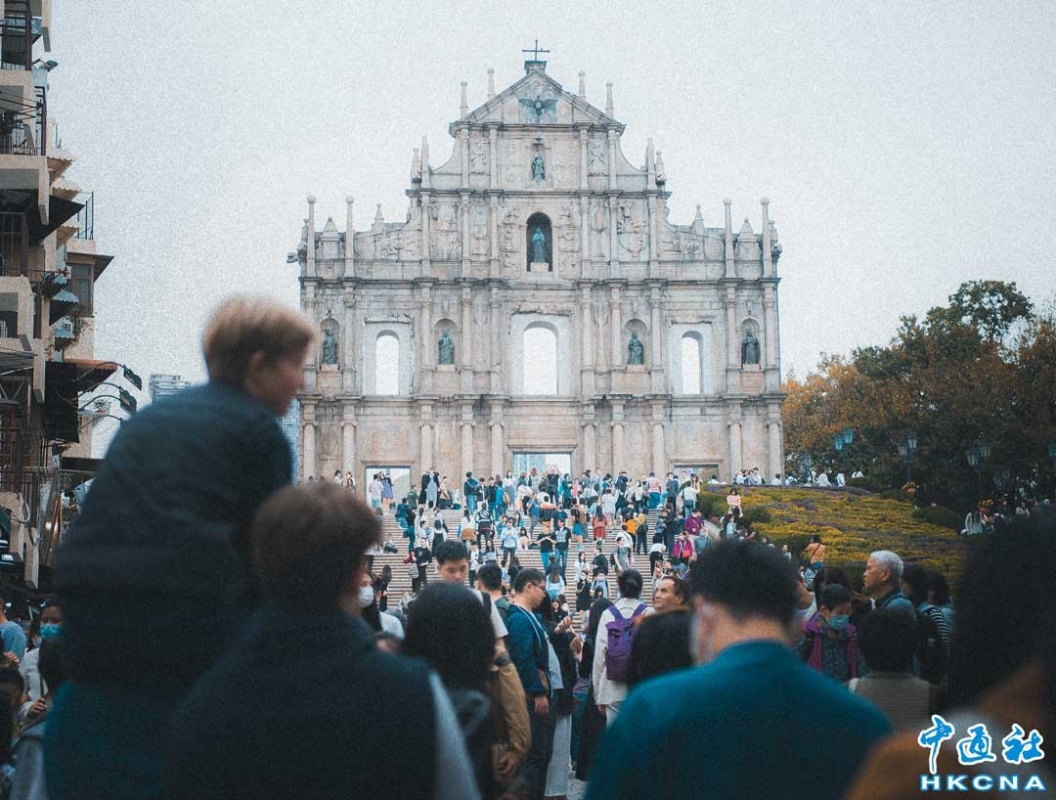 4月8日,旅客在澳門大三巴牌坊手信街。復活節假期,澳門大三巴牌坊、議事亭前地等景點人氣旺盛。香港中通社圖片
