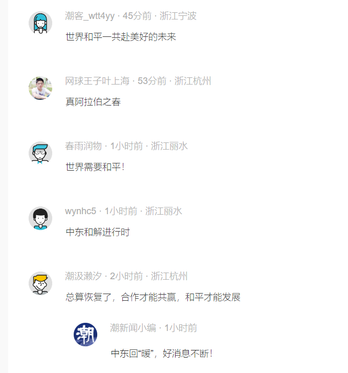 網友評論截圖。圖源:潮新聞 負責中東-北非地區的國際危機組織的高級顧問埃斯範德瑞向半島電視台記者表示,“實用主義的新時代已經降臨在了海灣合作委員會國家身上。僅靠遏制是行不通的,只有通過對話才能奏效。” 阿拉伯海灣國家研究所的非常駐研究員艾曼·侯賽因表示,海灣國家之間的分歧可能會繼續存在,但是海灣合作委員會國家將從更好的安全環境中受益。 (完) 【編輯:王軼南】