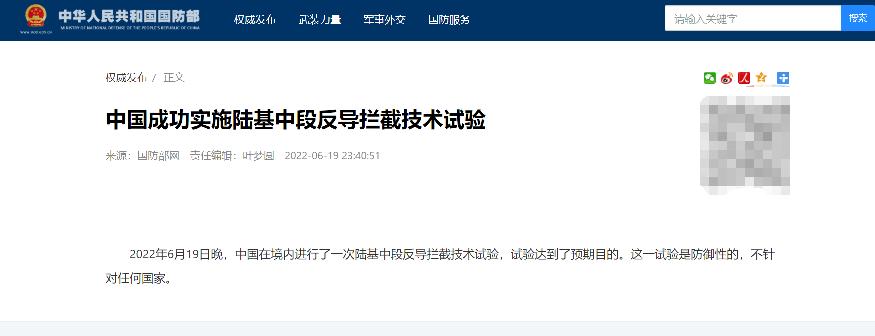 香港新聞網4月15日電 來自“國防部發佈”的消息,2023年4月14日晚,中國在境內進行了一次陸基中段反導攔截技術試驗,試驗達到了預期目的。這一試驗是防禦性的,不針對任何國家。