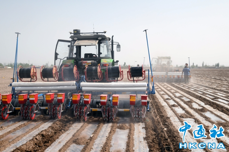 •   4月14日,新疆喀什地區巴楚縣的高標準農田裡棉花機械化播種。目前,喀什地區550萬畝棉花播種工作已進入高峰期,共有3749台播種機加裝了北鬥導航自動駕駛系統,機械播種達100%,預計4月下旬可全部播種完畢。 香港中通社圖片