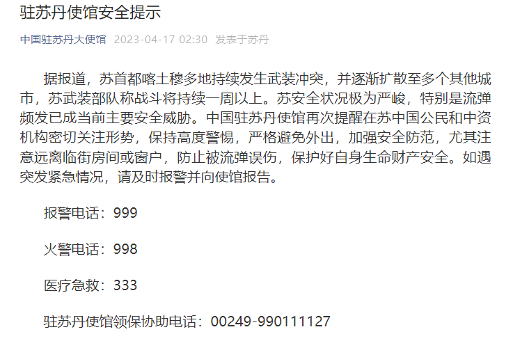 香港新聞網4月17日電 中國駐蘇丹大使館於17日淩晨再次發佈重要提示,請目前仍在蘇丹的中國公民和中資機構密切關注形勢,嚴格避免外出。