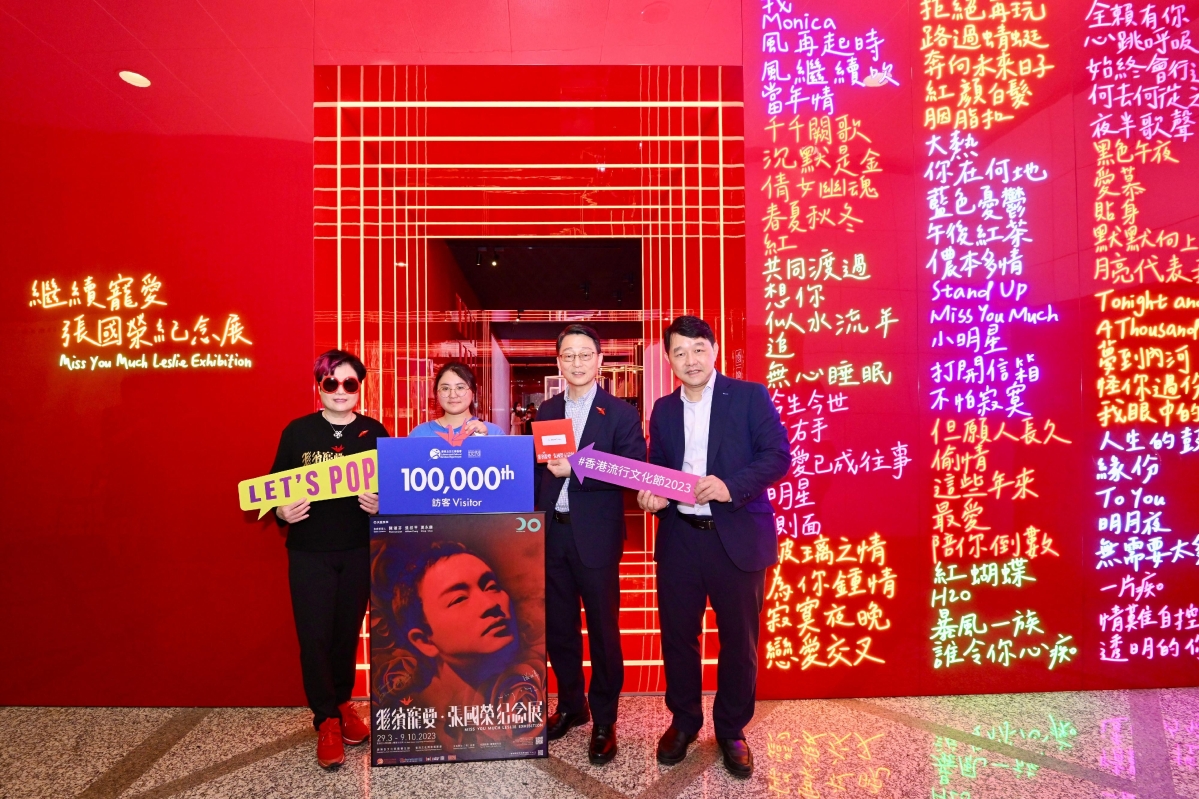 香港新聞網4月30日電 香港文化博物館為紀念一代巨星張國榮逝世20週年舉辦的“繼續寵愛・張國榮紀念展”,自3月29日開展以來深受市民及旅客歡迎。展覽於4月30迎來第10萬名參觀者。 為紀念這特別時刻,博物館為第十萬名觀眾準備了別具心思的禮物——附有三位客席策展人、張國榮生前摯友陳淑芬、張叔平及夏永康簽名的展覽海報及香港電影資料館“芳華再續”專題放映活動電影門票,並由康樂及文化事務署(康文署)署長劉明光及陳淑芬親自送上。陳淑芬亦將兩枚張國榮20週年特別版復古紀念銀章捐贈給香港文化博物館作永久收藏。