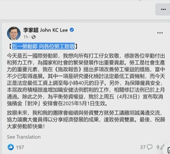 香港新聞網5月1日電 今日是五一勞動節,香港特區行政長官李家超在社交平台發文,向所有打工仔女致敬,同時感謝中央及廣東省政府一直以來的大力支持,推動和落實“港車北上”,為粵港之間的經貿和人文交流提供進一步的發展動能。“港車北上”計劃將於6月1日起接受香港車主申請,7月起可經港珠澳大橋往來廣東。 李家超感謝打工仔女的辛勤付出和努力工作,為國家和社會繁榮發展作出重要貢獻,指勞工是社會生產力重要元素。而《施政報告》提出多項改善勞工權益的措施,當中不少已取得進展,包括他於上周五宣布2025年5月1日起,取消強積金“對沖”。 李家超又指放眼未來,他和團隊會繼續與勞資雙方就勞工議題坦誠溝通交流,協力讓廣大僱員得以分享經濟發展的成果,達致勞資雙贏。