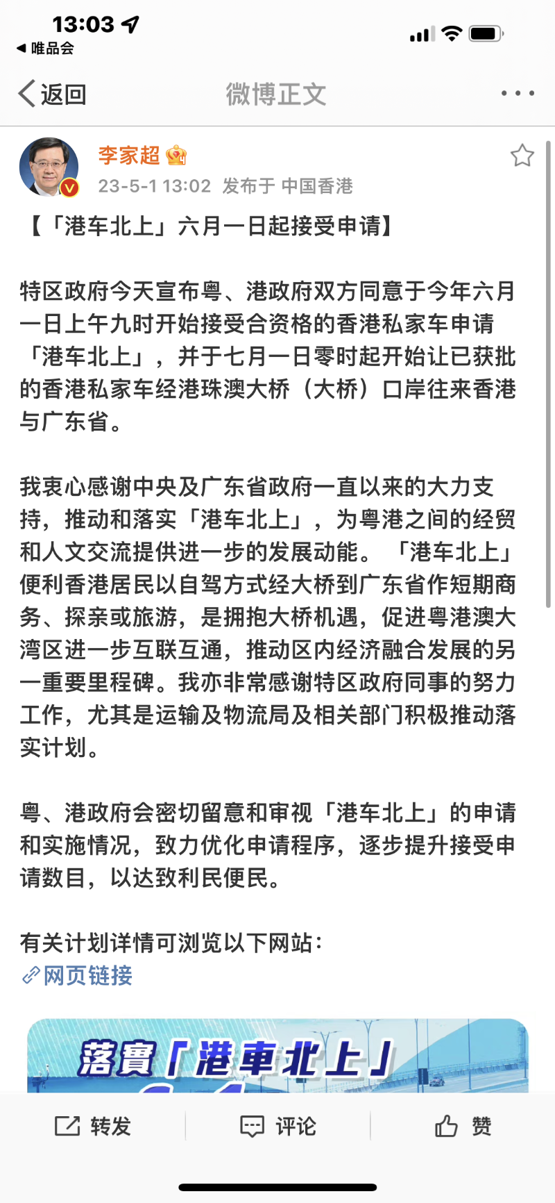 李家超同時發文,指特區政府今天宣布粵、港政府雙方同意於今年六月一日上午九時開始接受合資格的香港私家車申請“港車北上”,并於7月1日零時起開始讓已批獲的香港私家車經港珠澳大橋口岸往來香港與廣東。
