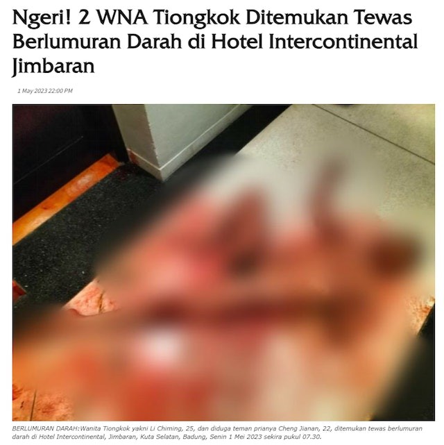 據印尼傳媒報道,案發現場有大量血迹(RadarBali網站截圖) 報道指,酒店職員1日清晨6時許,收到來自房間的求救電話,到場時發現25歲男死者倒臥在走廊,全身多處有傷口,額頭上有瘀傷;22歲女死者的遺體在房間的浴室被發現。兩人被發現時都是全身赤裸。 當地警方表示,兩名死者沒有遺失任何物品,不排除他殺的可能。 消息指,酒店房間是由女死者預訂,據閉路電視影片顯示,女死者4月30日晚上8時左右獨自前往酒店登記入住,然後到了5月1日淩晨0時17分左右,男死者抵達酒店大堂,與女死者見面,兩人再一起到房間。至淩晨0時50分左右,男死者一度離開房間,然後返回;至淩晨1時17分左右,酒店服務員前往房間送餐,到房內放下住客訂購的食物,然後離開;到了清晨6時32分,閉路電視畫面顯示男死者爬行離開房間,他身上有血,最終死在走廊上。 印尼警方表示仍在調查事件,現階段拒絕透露更多詳情。(完) 【編輯:王軼南】