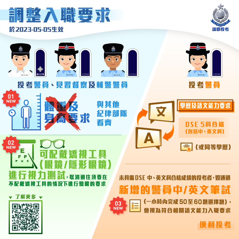 通說:香港警隊搶人才,為何招人這麼難?香港警務處今天宣布,本月5日起調整三項入職要求:取消身高體重限制、可佩戴眼鏡測視力、增加警員中英文筆試。 這對於受限身高和視力的投考者,可是重磅好消息。目前,投考警察的男生必須達到身高163厘米、體重50公斤;女性152厘米、42公斤。而視力測試必須摘下眼鏡。筆試以香港中學文憑考試中英文科第2級為基準,分為中文運用和英文運用兩份試卷。