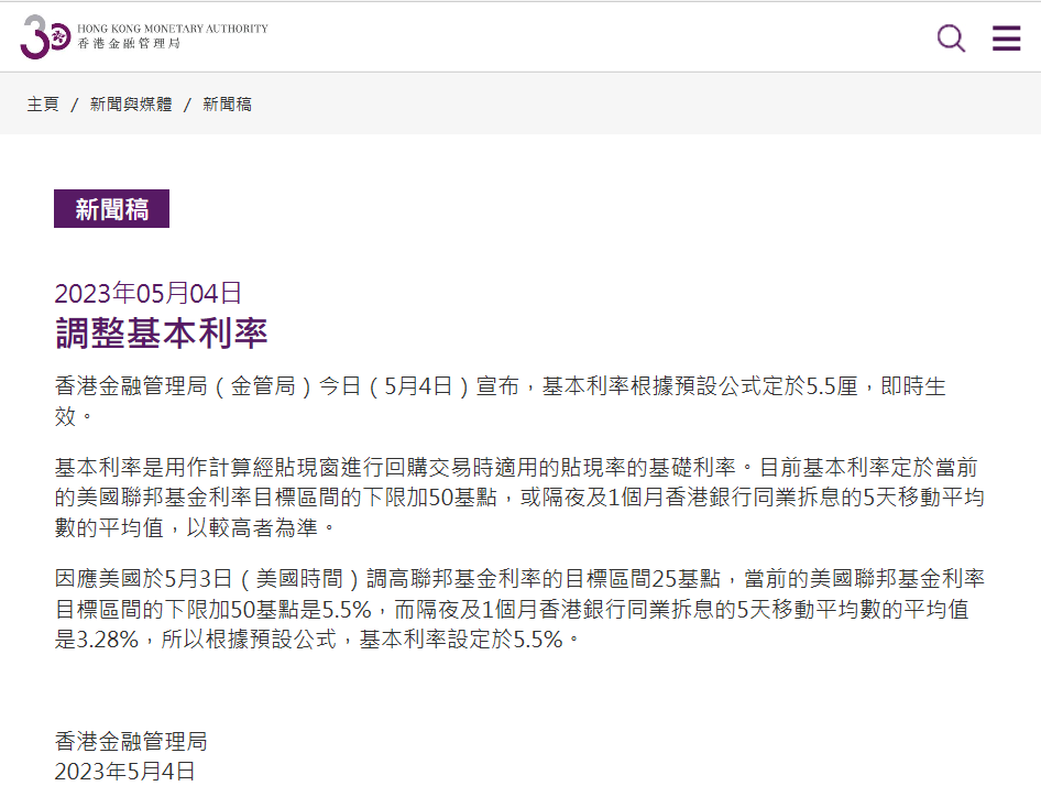 因應美國於當地時間5月3日下午調高聯邦基金利率的目標區間25基點,當前的美國聯邦基金利率目標區間的下限加50基點是5.5%,而隔夜及1個月香港銀行同業拆息的5天移動平均數的平均值是3.28%,所以根據預設公式,基本利率設定於5.5%。