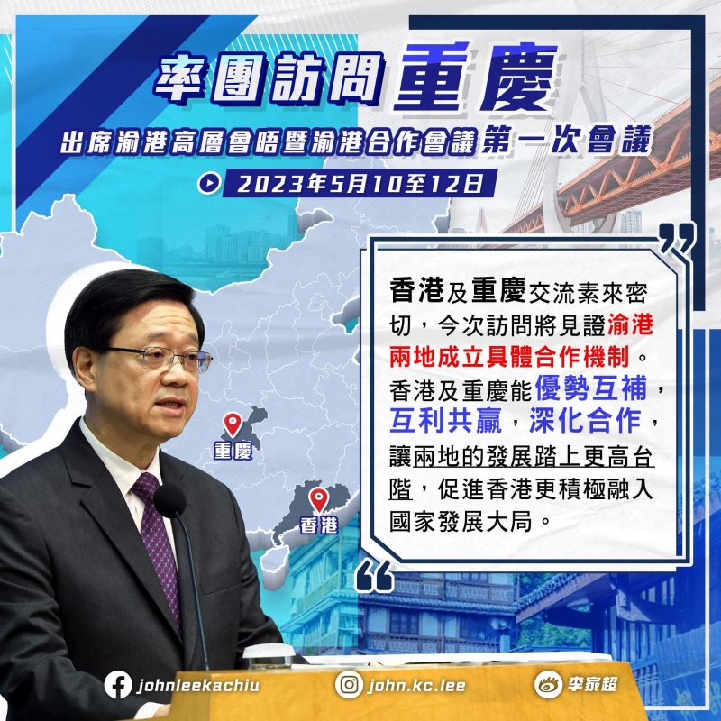 李家超fb圖片。 隨後,李家超在社交平台發文指,訪問期間,將會與重慶市領導會面,以及到訪當地城市規劃、創新科技和物流等方面的設施和項目。他強調,香港及重慶交流素來密切,這次訪問將為渝港兩地確立具體合作機制。期望香港及重慶在優勢互補,互利共贏的原則下全面深化合作,讓兩地的發展踏上更高台階。 香港特區政府代表團成員包括政務司司長陳國基、商務及經濟發展局局長丘應樺、創新科技及工業局局長孫東教授和政制及內地事務局副局長胡健民等。 李家超將於5月12日返港。在他離港期間,由財政司司長陳茂波署理行政長官職務。陳國基離港期間,由政務司副司長卓永興署理政務司司長職務。丘應樺離港期間,由商務及經濟發展局副局長陳百里博士署任商務及經濟發展局局長職務。孫東教授離港期間,由創新科技及工業局副局長張曼莉署理創新科技及工業局局長職務。(完) 【編輯:孟宜君】