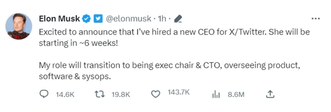 图源:网络 週四(11日),推特CEO馬斯克說,他爲推特找到了一位新CEO,他沒有透露此人的姓名,外界只知道這位新任CEO將是一位女性,並在未來六週內上任。 據《路透》引述有前員工透露,內部曾經討論的人選,包括Youtube前行政總裁武伊齊茨基(Susan Wojcicki)、雅虎前行政總裁邁耶(Marissa Mayer),還有為馬斯克誕下雙胞胎的女下屬齊里斯(Shivon Zilis)。報道又引述投資界人士表示,馬斯克其他公司的高級女性高管也可能被青睞,例如SpaceX的總裁Gwynne Shotwell和Tesla主席 Robyn Denholm。 馬斯克稱,待接班過渡期完結後,其在Twitter的職位將是執行主席兼技術總監(CTO),負責產品發展。 馬斯克本身是特斯拉(Tesla)行政總裁。去年10月斥資440億美元收購Twitter,並出任行政總裁。他曾表示完成收購的初期,需要做大量工作重組公司,但之後會減少在Twitter的時間。 在接管推特之後,馬斯克花費大量時間和精力在推特而非特斯拉上,特斯拉股價一瀉千里,令不少特斯拉股東呼籲,馬斯克應當儘快放棄推特CEO一職,專注於特斯拉。 現在馬斯克終於辭職了。受此消息推動,特斯拉股價週四尾盤快速上漲,收漲2.1%至172.08美元,特斯拉盤後股價延續漲勢。 (完) 【編輯:錢林霞】