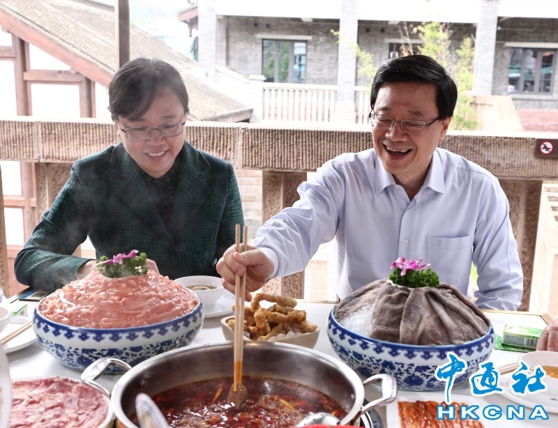 5月11日,香港特區行政長官李家超繼續在重慶的訪問行程。圖為李家超與重慶市副市長張國智(左)到磁器口歷史街區的一家火鍋店,品嘗重慶麻辣火鍋。 香港中通社圖片 李家超續說,他更向當地媒體推薦多個“必到打卡”的香港著名旅遊景點,爭取每個機會說好香港故事。 【編輯:李泺】
