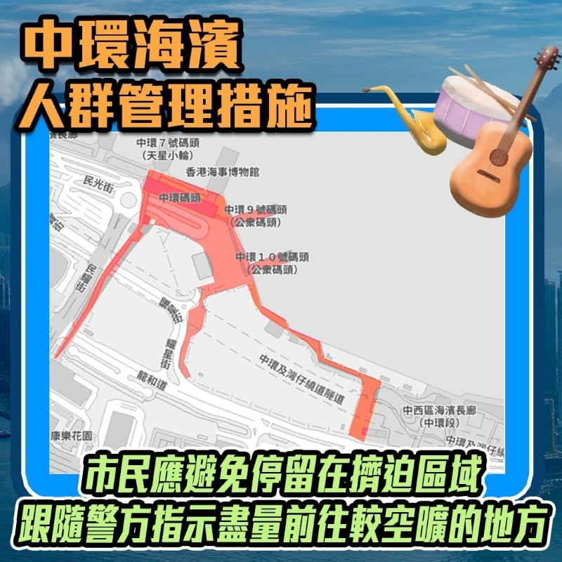警方圖片。 警方通報,當晚或會在人多擠迫路段實施單向人群管理,或暫時封閉過於擠擁的地方以疏導人群及減低風險。警方提醒市民應避免停留在擠迫區域,並跟隨警方指示盡量前往較空曠地方;提醒活動進行期間,切勿攀爬圍欄、花槽及建築物以觀賞活動。 另外,多名網友在社交平台發文指由於現場人數過多,非常擁擠很不安全,擠到頭暈缺氧臉脹紅。 據網上多張現場照片顯示,近日現場人群圍堵得水洩不通,很難移動,就連通往中環海濱的行人天橋上也擠滿了人。部分未能成功購票的歌迷更出盡奇招,為了看偶像一眼,除了伸長自拍神器外,更不惜攀爬2公尺高的圍牆,非常危險。(完)
