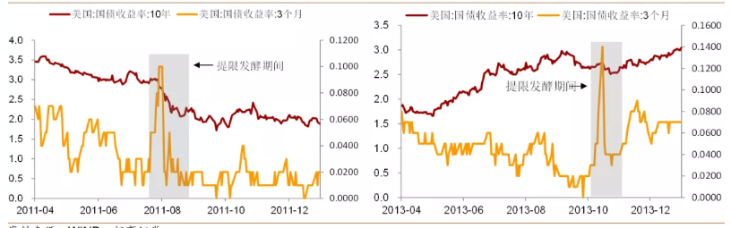 公眾持有的聯邦政府債務占GDP比重(1940-2031) 資料來源:CBO 談判失敗會對全球有什麼影響? 那麼,美國債務上限問題得不到解決,即此次談判失敗會對全球有什麼影響? 如果上提限議案討論過程無法順利完成,債務上限危機將會再次發酵,推升美國主權債務風險,會對資本市場造成一定短期影響。 回看歷史,2011年8月,在美國政府不斷迫近技術性違約情況下,美國首次遭遇主權信用降級國際信用評級機構標準普爾降級。 因此,若此次談判失敗,將引發全球金融市場動蕩。首先受到影響的就是美國短期國債利率。從2011年和2013年兩次債務提限前後短期國債收益率的表現來看,2011年8月2日之前,因為是否提限的結果還不明朗,近期到期債務的償還存在不確定性,投資者拋售國債,致使短期國債的收益率飆升,以3個月到期的國債為例,自2011年7月1日至8月1日期間,3M國債收益率上昇8個基點至0.10%;而在8月2日提高債務上限協議通過的當日,3M國債收益率下降了4個基點至0.06%,債務上限的談判對短期國債的影響很大。2013年10月17日推遲債務上限時間的協議通過前後,短期國債收益率的變化趨勢和2011年相同。