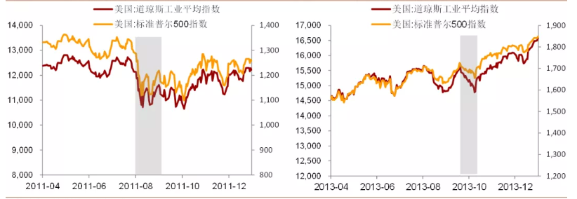 資料來源:WIND 招商證券 其次也會對股市造成衝擊。在2011年和2013年債務危機發酵期間,受市場避險情緒的影響,美股下跌,而在債務提限協議通過後,市場風險偏好情緒又顯著回暖,股價相應回升。以道瓊斯工業指數和標普500指數為例,兩者在2011年8月和2013年10月前後都呈現了先下跌、後回升的走勢,與提高債務上限相對應。