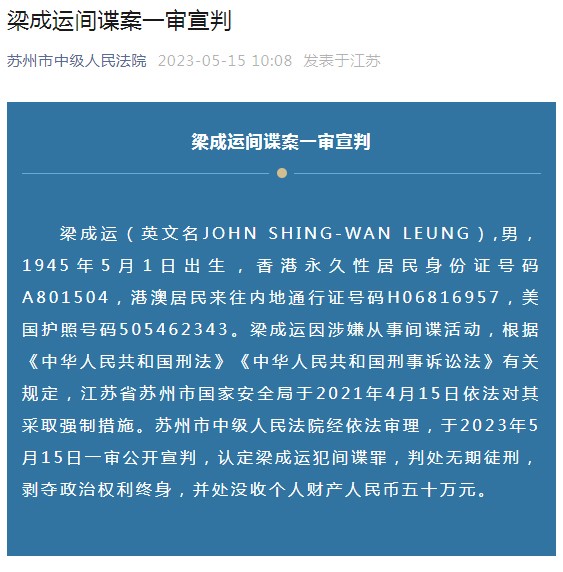 “蘇州市中級人民法院”微信公眾號圖片。 被告梁成運(英文名 JOHN SHING-WAN LEUNG),1945年5月1日出生,持有香港永久性居民身份證、港澳居民來往內地通行證及美國護照。因涉嫌從事間諜活動,根據《中華人民共和國刑法》《中華人民共和國刑事訴訟法》有關規定,江蘇省蘇州市國家安全局於2021年4月15日依法對其採取強制措施。 蘇州市中級人民法院經依法審理,於2023年5月15日一審公開宣判,認定梁成運犯間諜罪,判處無期徒刑,剝奪政治權利終身,並處沒收個人財產人民幣50萬元。(完)