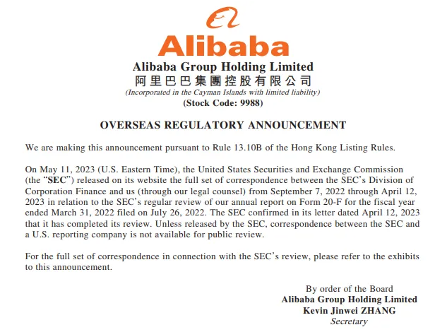 香港新聞網5月16日電 阿里巴巴在聯交所公告稱,在經過幾次交流後,美國證券交易委員會(SEC)於4月12日完成了對公司的評估,年報獲SEC審查通過。消息甫一公佈,阿里巴巴美股收報88.34美元,彈3.52%,盤後微升0.08%。而今早香港股市開盤,一度低迷的股市也迎來了上漲。 2021年8月,美國證券交易委員會發佈消息要對在美國上市的中國企業加強審查。2021年12月20日,美國SEC的公司融資監管部(The Division of Corporation Finance)在部門主頁發佈了《致中國問題信函範本》,提出了對包括阿里巴巴在內的幾家在美國上市的中國上市進行年報審查。特別提出了信息監管、VIE合法性、外國公司問責法適用、中國政策影響的披露要求,并需要在招股說明書的封面上特別披露以下內容:以VIE結構為主體、開曼公司上市、中國法律風險等。 SEC此前要求阿里披露其在開曼群島的一家控股公司,及位於中國的可變權益實體(VIE)的信息,原因是該監管部門認為其可能對投資者構成風險。 歷經半年,美國證券交易委員會(SEC)於4月12日完成了對阿里巴巴公司的評估,年報獲SEC審查通過。