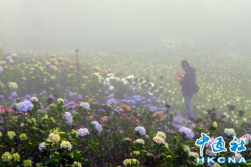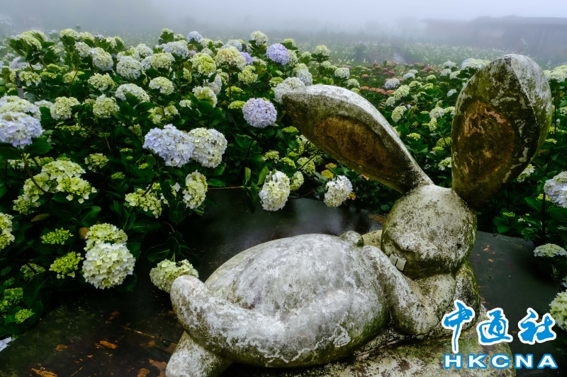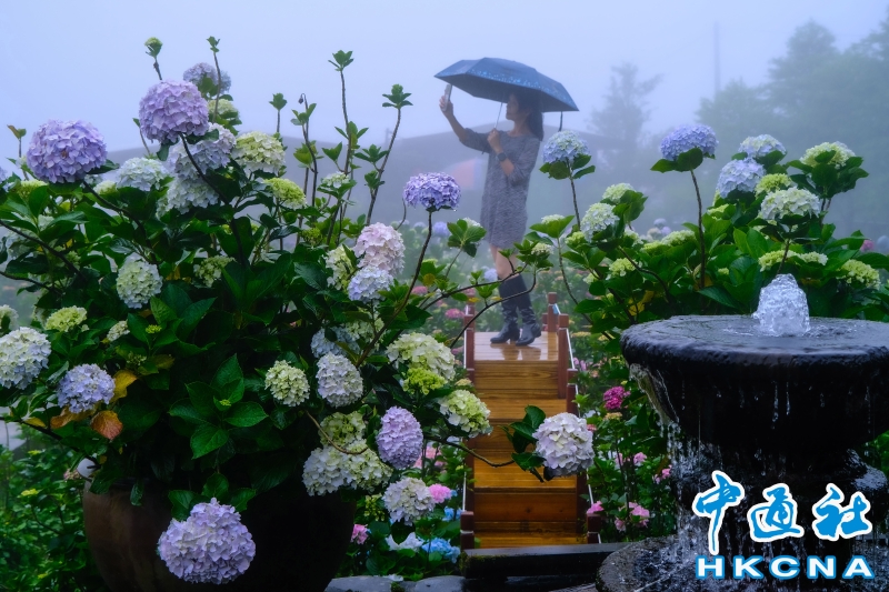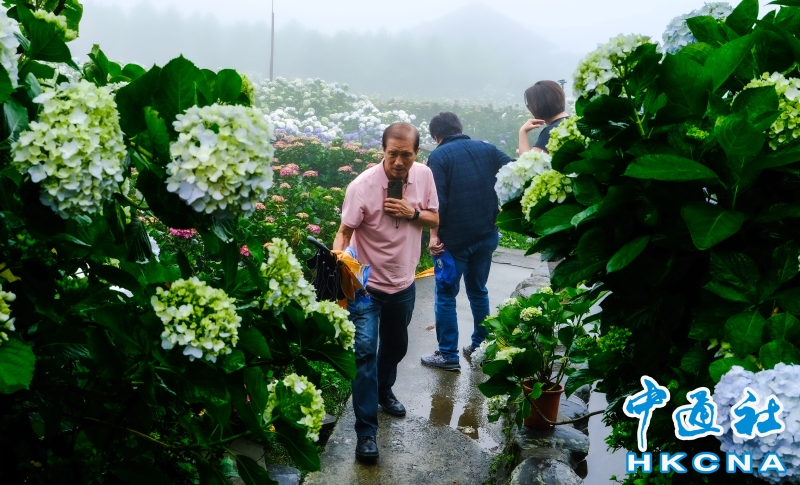 一欉欉的繡球花田開滿竹子湖畔,目前正值梅雨季節,賞花時宛如有雲霧繚繞的意境,花農表示,這是季節獨有的芬圍特色,由於海竽即將退場,因此五月可將海芋、繡球花都盡收眼底,遠離塵囂、放鬆心情,享受大自然充滿詩情畫意的禪意洗禮。 香港中通社圖片