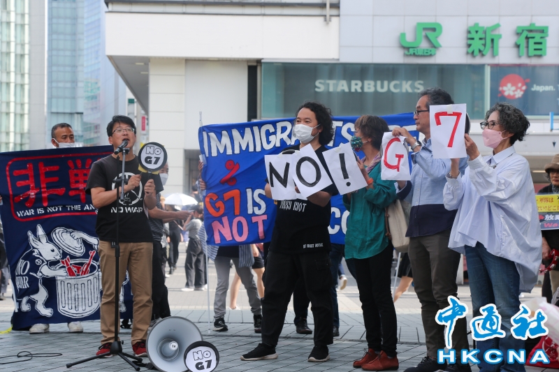 •   5月21日,日本民眾手舉標語,在東京新宿車站附近舉行集會,強烈抗議G7廣島峰會。 香港中通社圖片