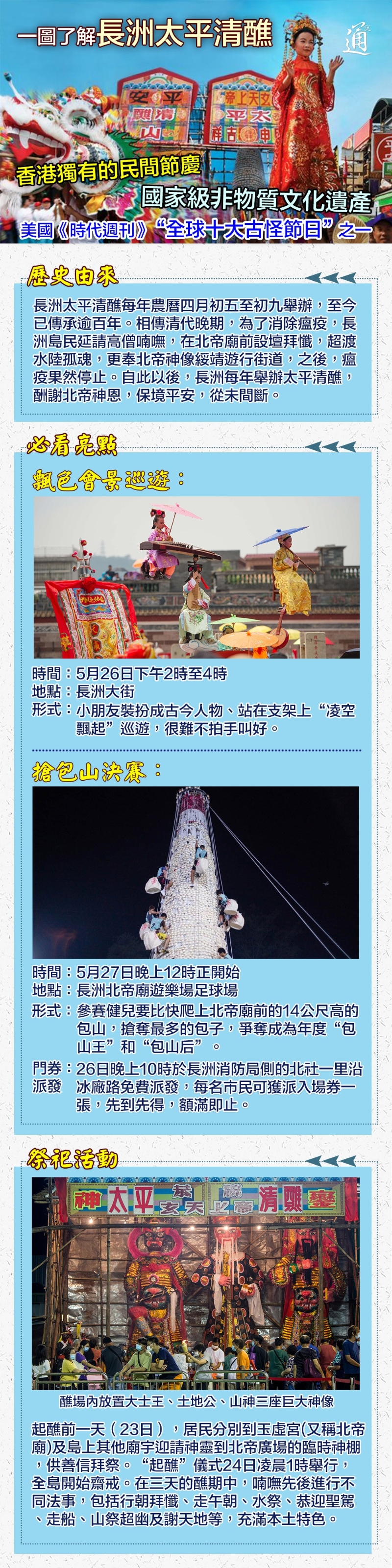 香港新聞網5月24日電 香港長洲太平清醮於每年農曆四月初五至初九舉辦,至今已傳承逾百年。這個香港獨有的民間節慶,於2011年被列入第三批國家級非遺代表性項目名錄,曾被美國《時代週刊》評選為“全球十大古怪節日”之一。 相傳清代晚期,為了消除瘟疫,長洲島民延請高僧喃嘸,在北帝廟前設壇拜懺,超度水陸孤魂,更奉北帝神像綏靖遊行街道,之後,瘟疫果然停止。自此以後,島民每年舉辦太平清醮,酬謝北帝神恩,保境平安,從未間斷。 太平清醮祭祀活動充滿本土特色。起醮前一天,居民分別到玉虛宮(又稱北帝廟)及島上其他廟宇迎請神靈到北帝廣場的臨時神棚,供善信拜祭。今年“起醮”儀式於24日(農曆四月初六)凌晨1時舉行,全島開始齋戒。在三天的醮期中,喃嘸先後進行不同法事,包括行朝拜懺、走午朝、水祭、恭迎聖駕、走船、山祭超幽及謝天地等。 要論節慶的必看亮點,要屬飄色會景巡遊和搶包山。今年飄色會景巡遊於5月26日下午2時至4時在長洲大街舉行,門票免費派發,先到先得。屆時小朋友裝扮成古今人物、站在支架上“凌空飄起”巡遊,很難不拍手叫好。 飄色巡遊過去有諷刺時弊的元素,惠海陸同鄉會飄色總監黃成就表示,今次飄色不會涉及太多政治元素。據悉,今年飄色巡遊主題包括角色扮演財政司司長陳茂波,扮演者手捧黃金,寓意“財爺派糖”;另有反映公共交通加價、消防救援赴土耳其救災等主題。 另一傳統項目是搶包山,搶包山決賽將於5月27日晚上12時正開始,參賽健兒要比快爬上北帝廟前的14公尺高的包山,搶奪最多的包子,爭奪成為年度“包山王”和“包山後”。三座大包山一直是醮會重要標誌之一,但今年因承建商拒絕接辦,結果只能“畫餅充饑”,以大包山掛畫和小包山頂替,令不少網友大嘆失望。 長洲太平清醮值理會日前在社交平台發文表示,承做包山竹架的承建商於3月左右交付報價單,因物價上升及疫情影響多年未有使用,需要重新製作,故提升造價。承辦商其後於3月底再回覆,稱因為人手及體力問題估計未能完全有關製作,須由值理會自行處理。由於時間倉促,值理會只得以掛畫頂替三座大包山。有關本年度的方案,該會稍後會作出檢討,祈望明年會更好。