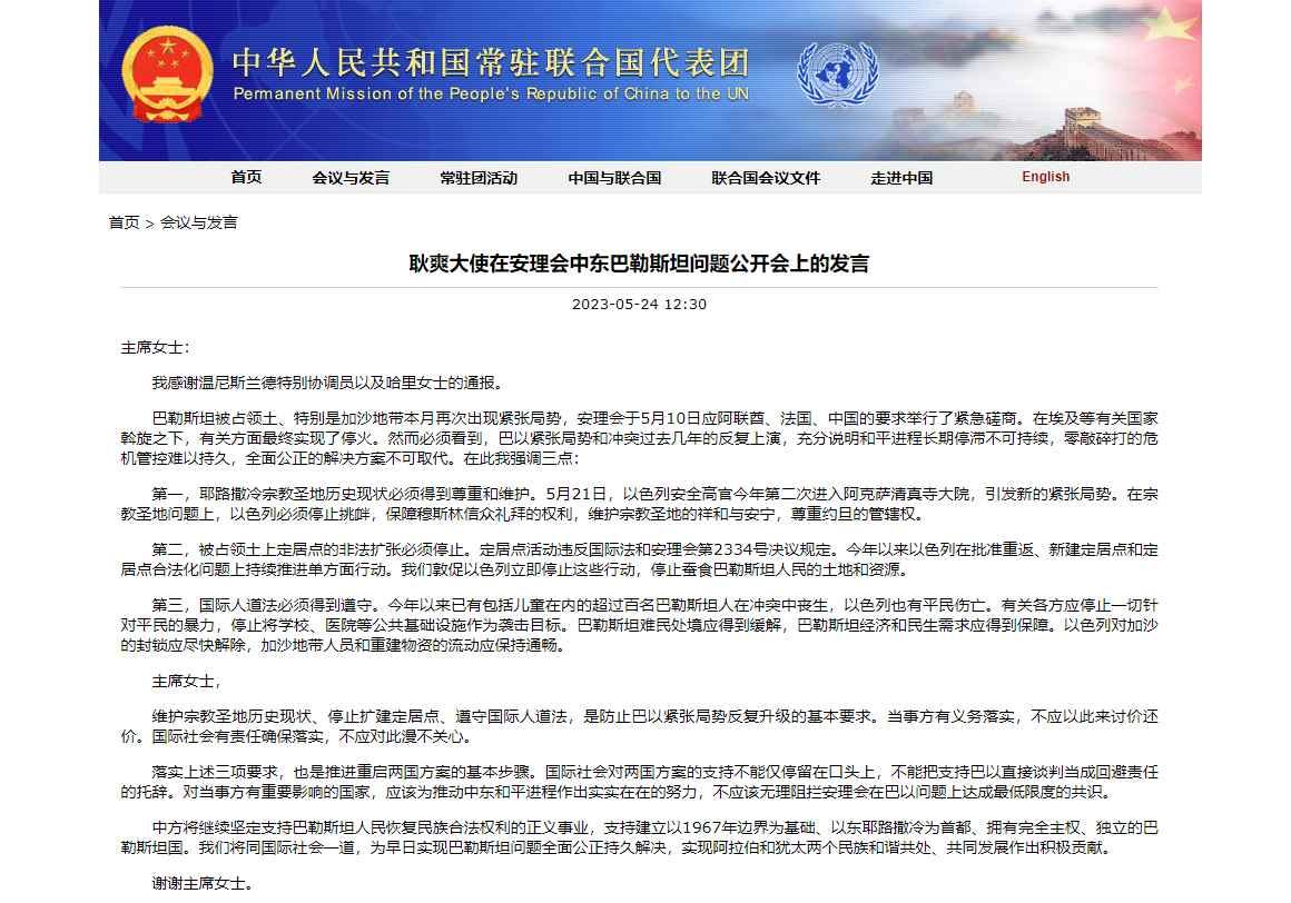 香港中通社5月25日電 中國常駐聯合國副代表耿爽當地時間24日表示,今年以來以色列在批准重返、新建定居點和定居點合法化問題上持續推進單方面行動,中方敦促以色列立即停止這些行動,停止蠶食巴勒斯坦人民的土地和資源。