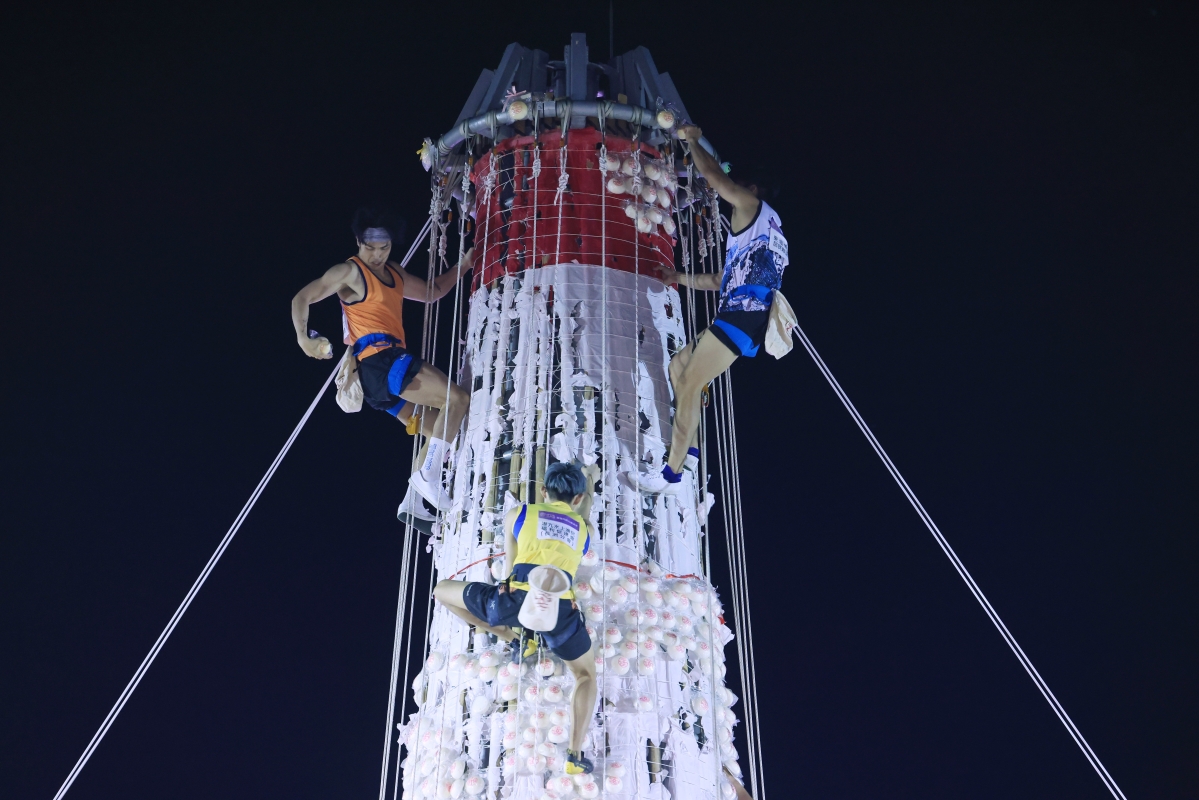 香港新聞網5月27日電(記者 許其皓)5月27日凌晨,香港“包山嘉年華2023”壓軸項目“搶包山決賽”在長洲舉行,這是香港全面復常後首次舉辦該活動,比賽現場吸引了大批觀眾入場觀賽。本次決賽舉行單人賽和接力邀請賽,最引人注目的單人賽有9男3女共12名選手施展渾身解數,爭奪獎項,選手要在3分鐘內爬上包山盡量摘取平安包並在倒計時前返回地面,總分最高者獲勝。最終包山王由鍾玉川奪得,黃嘉欣奪得包山后。