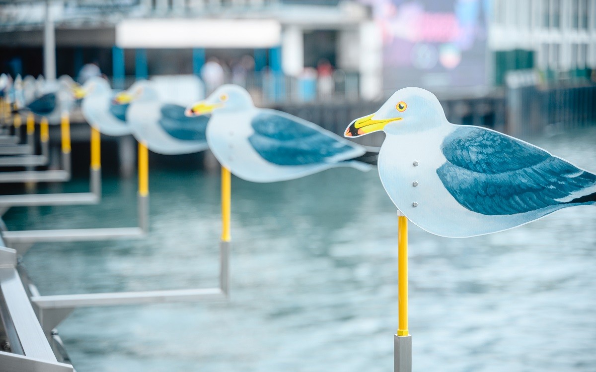 “海鷗の港”即日起在海運大廈外展出。 “海鷗の港”是木村崇人的經典“風向儀系列”的新作品,它不單是一件公共藝術裝置,亦是一個讓人與大自然互動的裝置。他分享道,“風向儀系列”的設計靈感來自他偶然遇見的海鷗群,當時牠們整齊地排列在岸邊,但當有海風的轉變,牠們就會一致地改變站立方向,呈現出令人嘖嘖稱奇的大自然景觀。他感嘆海鷗懂得迎面向風來減低阻力,並隨即明白到古人為何會以鳥的形狀為藍本製作風向儀。今次作品中的62隻海鷗立板印有黑尾鷗圖案,正如現實世界的海鷗群般,會隨着海風左右擺動。 【編輯:黃璇】