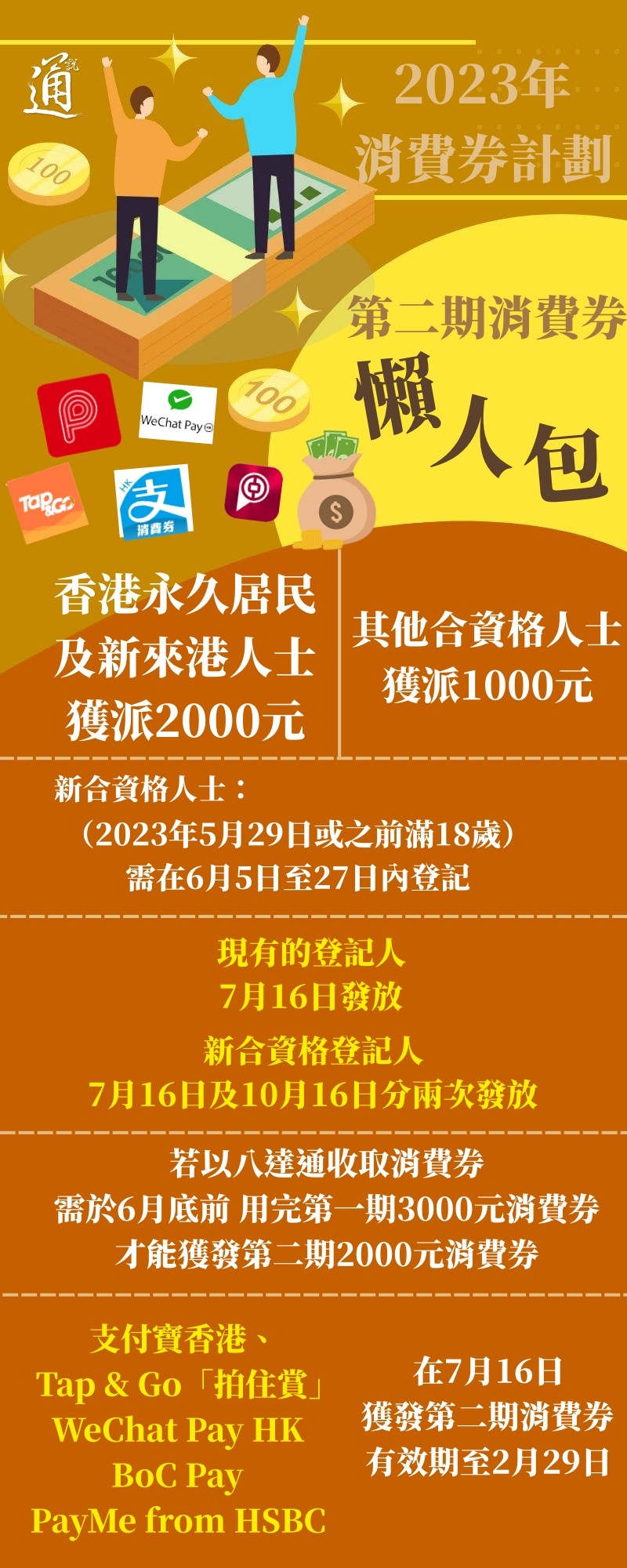 香港新聞網5月29日電 香港特區政府財政司司長陳茂波今天下午公布2023年第二期消費券計劃詳情。第二期消費券將於7月16日向現有的登記人派發2000元或半額1000元。 有意轉換支付工具者,需在6月5日至27日內辦理相關手續。至於新登記人亦需在上述限期內登記,即可以在7月16日及10月16日分兩次獲發消費券。 另外,若以八達通收取消費券需於6月底前用完第一期3000元消費券,才可獲發第二期2000元消費券。至於使用支付寶香港、Tap & Go“拍住賞”、WeChat Pay HK、BoC Pay及PayMe from HSBC收取第一期消費券的市民,則可在7月16日獲發第二期消費券,有效期至2月29日。(完)