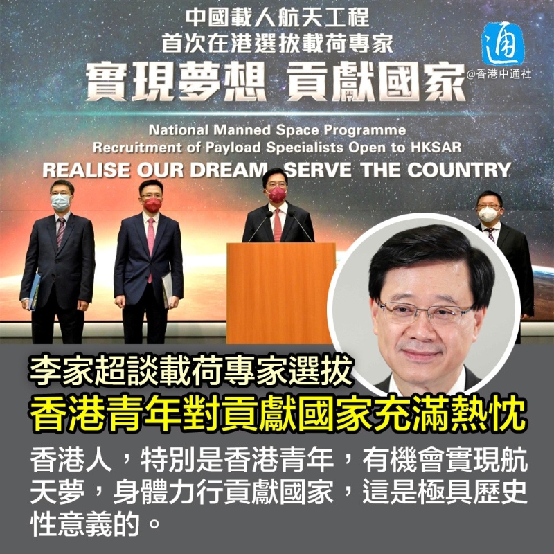 中國首次在港澳地區選拔航天載荷專家(政府新聞處) 李家超說,國家首次在香港選拔載荷專家,標誌著國家對香港科技界的高度重視和肯定,以及對香港作為國際創新科技中心的認同。這次選拔既代表著國家鼓勵和歡迎香港同胞在國家發展中作出貢獻,亦體現了國家對香港青年發展的關心。