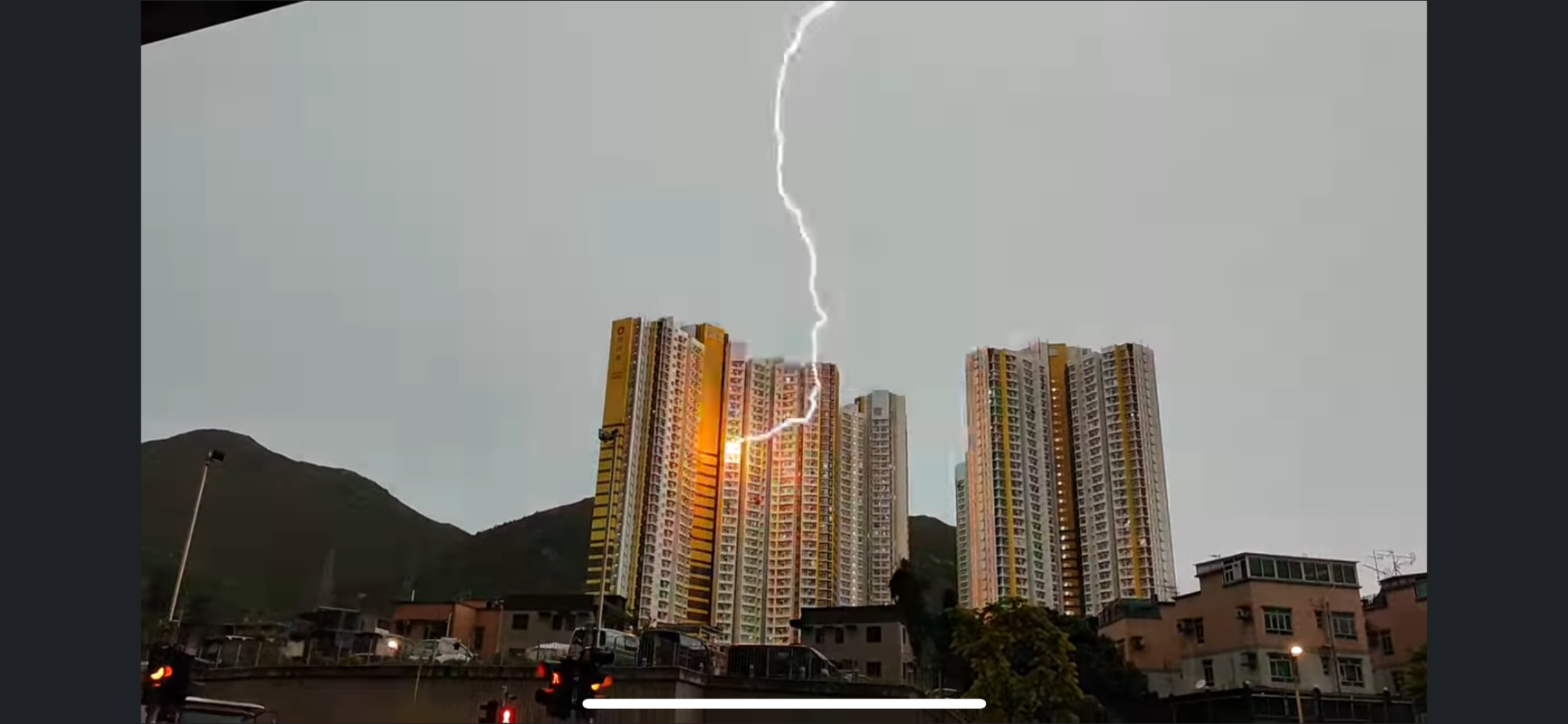 影片截圖。 根據網上流傳的10秒影片中可見,天空烏雲密布,突然一道閃電劃破天際,擊中一個大廈的中層單位,期間一度閃出火光,相隔1秒後天空始傳來巨響,場面相當駭人。影片上傳後隨即引起網友熱烈討論,不少人開玩笑稱:“是雷神住裡面嗎?”、“又有人在發誓?”、“有人渡劫成功,可以做神仙了!”;亦不少人關心戶主安危,留言稱“裡面的人有沒有事?”,“不是有避雷針嗎?這樣也劈中?”、“這雷懂得轉彎?”。 據知,事件發生在今早近7時,被雷擊中的單位位於屯門和田邨一單位,戶主為尼泊爾家庭,一家四口入住上址約半年時間。女戶主Gurung Preeti 事後接受傳媒訪問時憶述,當時正在主人房中為幼女梳頭準備上課,眼前突然出現黃色閃光並伴隨著巨響。她又說,自己第一次遇到這種情況,當時的聲音很嚇人,整個房子都彷彿在晃動,自己感到非常危險和害怕。 她續說,事發後自己馬上帶同女兒跑離房間,幸好事件中無人受傷,家中的電器亦無礙。事發後,丈夫檢查發現單位睡房窗戶外一處外牆崩毀,相信就是被雷擊中,導致部分混凝土掉落。而大廈保安接獲通知後,亦已經在今早10時許上門了解並拍照紀錄。 而Gurung Preeti 的鄰居表示,當時自己剛收回晾在窗外的衣服,準備回床上繼續睡覺,突然聽見三聲巨響,隨後伴隨輕微震動。他又稱,當時不知道大廈遭雷擊中,太太雖然一度起身查看但未有察覺任何異樣,冷氣機等亦運作正常。 翻查香港天文台記錄,今日凌晨3時15分天文台一度發出雷暴警告,生效近6.5小時後,在今早9時55分始取消。而在凌晨3時起至今早9時,香港發生12367次雲對地的閃電,另有23,886次雲間閃電。 (完) 【編輯:孟宜君】