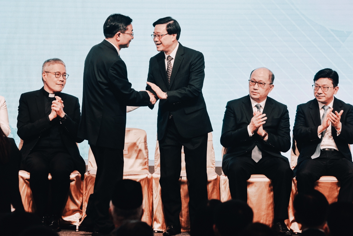 5月29日,2023香港社福開新篇高峰會暨香港社福界心連心大行動成立典禮上午在灣仔會展中心舉行。圖為香港特區行政長官李家超與中國國家民政部副部長柳拯在啓動儀式上握手交流。 (香港中通社記者 謝光磊攝)