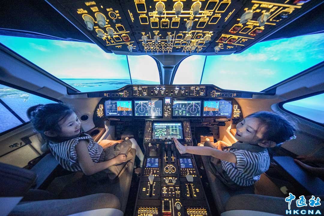 6月1日,天津,小朋友在C919科普模擬機駕駛艙內進行飛行體驗。當天是“六一”國際兒童節。香港中通社圖片