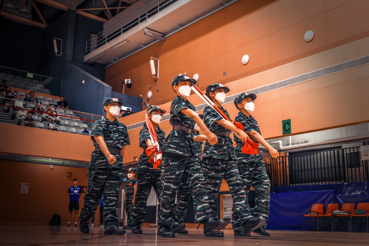 6月4日,慶祝香港回歸祖國26週年“尊重盃”校際武藝操大賽在香港舉行。比賽分為中學組、小學組和展能組(特殊學校),參賽學生逾400人。圖為賽前舉行升旗儀式。 (香港中通社記者 許其皓攝)