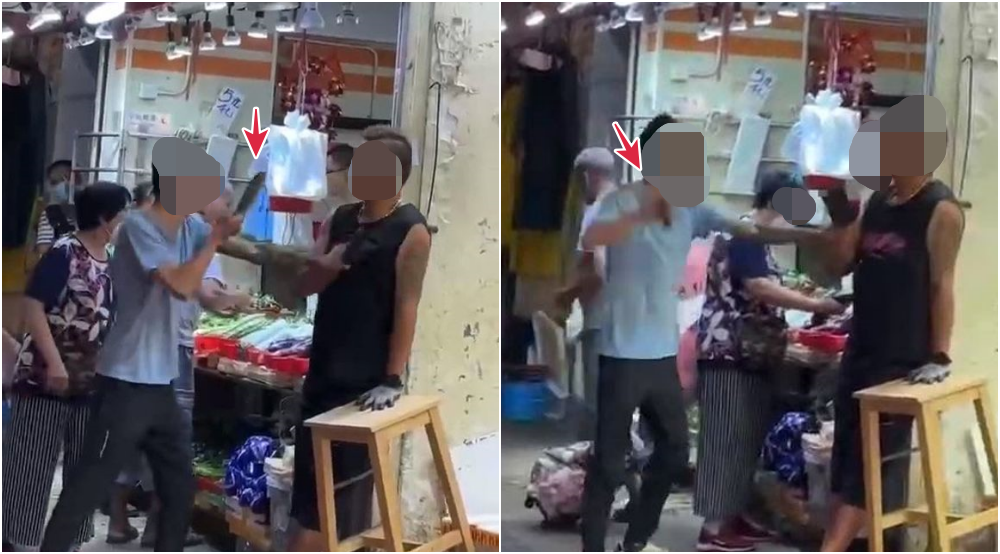 劉男揮舞菜刀指嚇對方。網圖 劉男隨後折返菜檔與職員理論,期間揮舞菜刀指嚇對方。幸好當時有兩名機動部隊警員巡經上址附近,在接獲途人求救後,他們隨即趕往現場,成功將男子制服。經調查後,以涉嫌藏有攻擊性武器將他拘捕。事件中無人受傷。案件交由荃灣刑事調查隊第三隊跟進。 根據網上流傳影片可見,當時一名手臂上有紋身的男子手持菜刀,不斷指嚇另一名男子。而附近人士則表現十分淡定。(完) 【編輯:孟宜君】