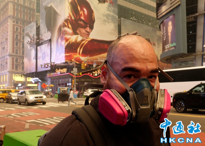 •   當地時間6月7日,美國紐約時報廣場的一位路人佩戴著呼吸過濾器。近日,加拿大野火產生的煙霧蔓延至美國,紐約市出現霧霾,戶外民眾嚴密防護。 香港中通社圖片