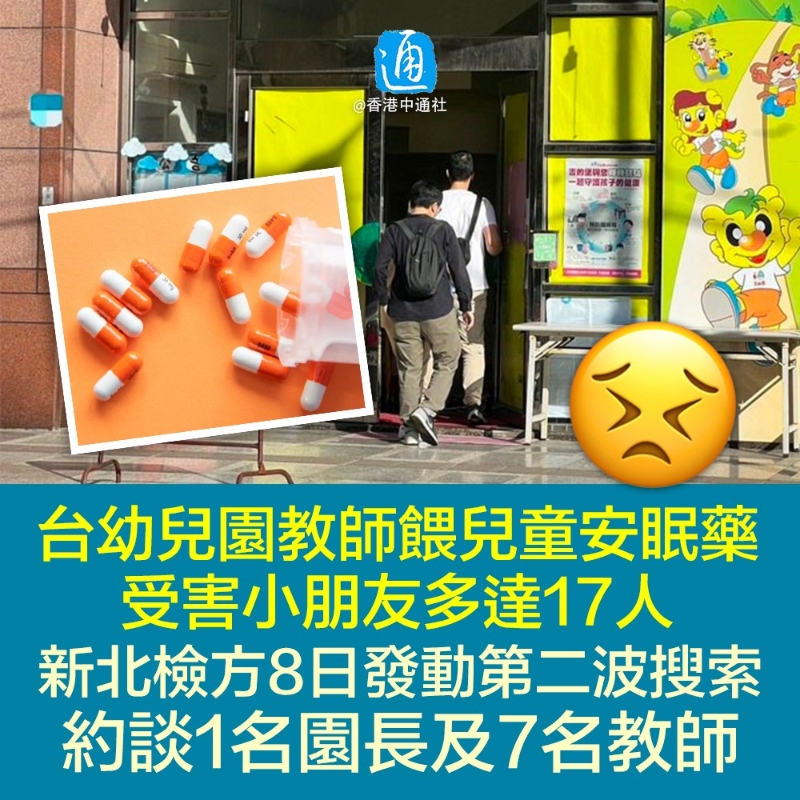 香港新聞網6月8日電 台灣新北市一幼兒園上月爆出老師疑似向幼童餵食安眠藥,報案家長已達17人。新北檢方今日(8日)發動第二波搜索,約談1名園長及7名教師。 新北市警局5月14日接到3名家長報案,稱子女就讀板橋區某幼兒園,2月至4月期間出現情緒易怒、精神恍惚,甚至自殘等行為,經詢問稱被老師餵食不明藥物及遭到不當體罰。家長帶孩子到醫院進行檢驗,竟在體內驗出管制藥品“巴比妥(Barbiturates)”。警方調查後拘捕一名趙姓女教師,她被控刑法傷害、藥事法、妨害幼童發育及兒少法等四罪,目前保釋候審。