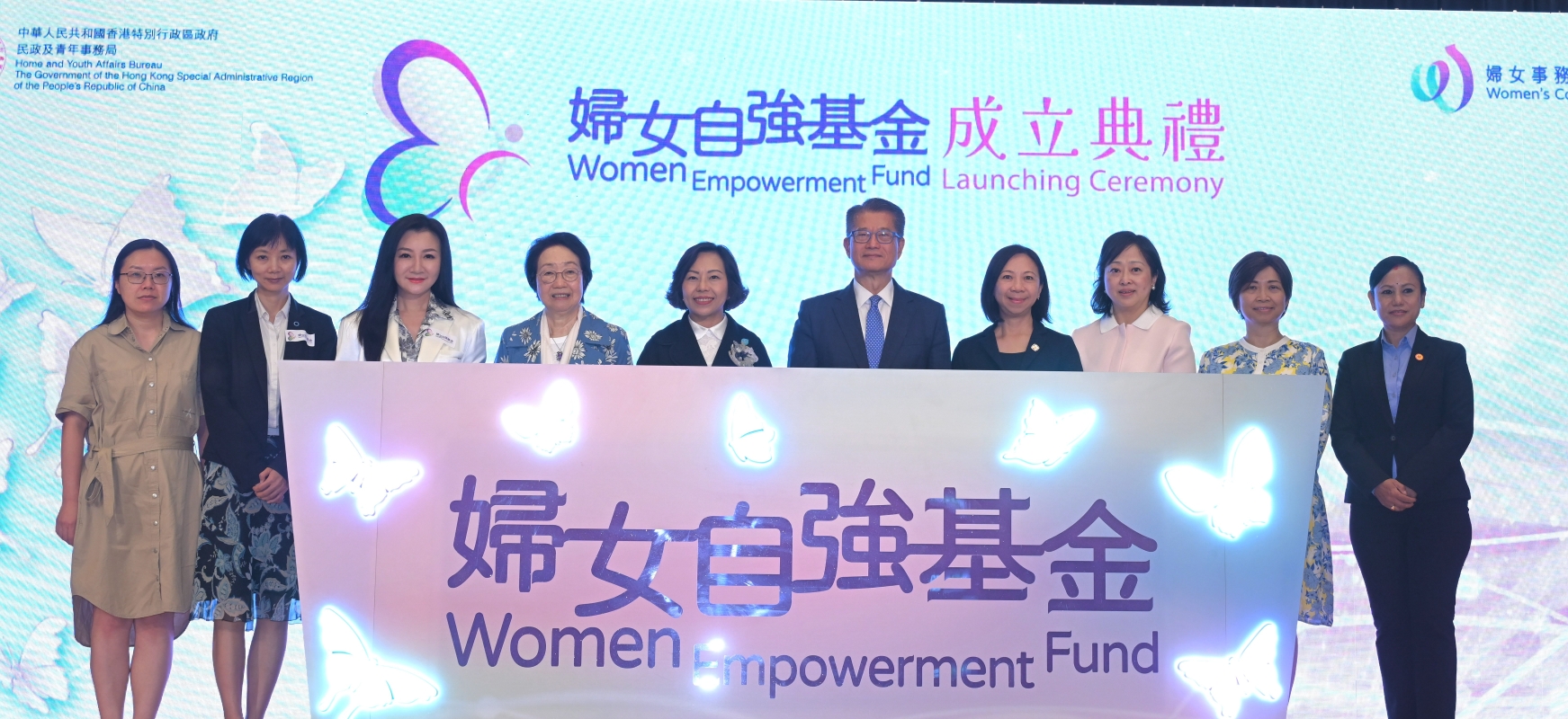 圖示(左四起)婦女事務委員會主席陳婉嫻、民政及青年事務局局長麥美娟、陳茂波、民政及青年事務局常任秘書長林雪麗,以及其他嘉賓在典禮合照。 他續說,本屆政府亦高度重視婦女的發展。行政長官於去年《施政報告》中提出成立“婦女自強基金”,而自己在今年的《財政預算案》亦撥出一億元加強對婦女發展的支援。這筆撥款將在往後數年注入“婦女自強基金”,資助婦女團體及非政府機構進一步協助婦女發展個人潛能、為自我增值,提升兒童看管服務等,回應在職婦女的需要。 (完) 【編輯:孟宜君】