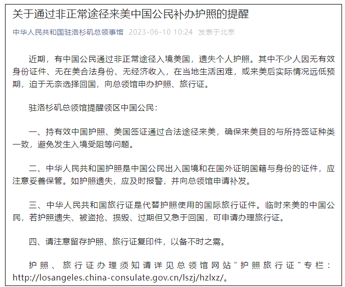 香港新聞網6月11日電 6月10日,微信公眾號“中華人民共和國駐洛杉磯總領事館”發佈關於通過非正常途徑來美中國公民補辦護照的提醒: