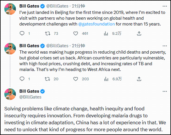 蓋茨推特截圖。 比爾·蓋茨表示,時隔三年再度來華,希望將中國在解決氣候變化、健康不公平和糧食安全的成功經驗分享給世界。比爾·蓋茨也在微博發佈了類似內容。