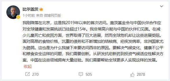 蓋茨微博截圖。 蓋茨基金會 2007 年成立北京代表處,2008 年啟動首個在華項目。此後十餘年間,基金會不斷擴大對華合作,項目涵蓋扶貧、結核病和艾滋病防治、煙草控制、助力非洲農業發展和消除瘧疾等。 比爾·蓋茨上次訪華是在2019年11月,當時他曾高度讚賞中國在健康扶貧領域取得的巨大成就以及中國為推動國際合作、促進世界可持續發展作出的重大貢獻。他曾表示,蓋茨基金會願同中方繼續加大衛生、減貧、社會公益等領域合作,并共同致力於幫助其他發展中國家農業、衛生事業發展。 另據路透社報道,比爾·蓋茨此行還將與中國國家主席習近平會面。(完) 【編輯:王軼南】