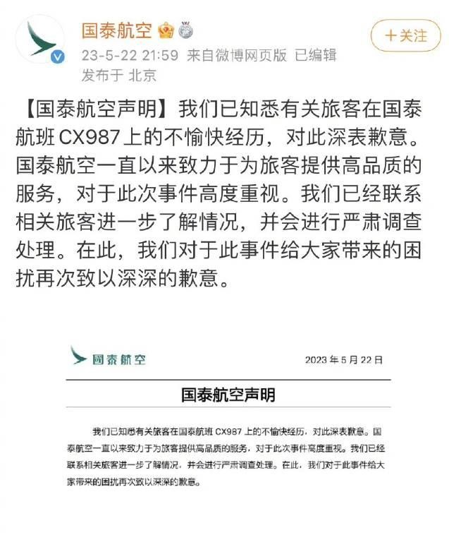 國泰聲明。圖源:微博截圖 23日下午,國泰航空再度發佈聲明,鄭重道歉,并表示高度重視此事件。 聲明表示,為了避免同類事件再次發生,國泰航空行政總裁林紹波將親自領導跨部門的工作小組作出全面檢討,重新審視服務流程、人員培訓和相關制度,進一步提升國泰航空的服務品質。 (完) 【編輯:王軼南】