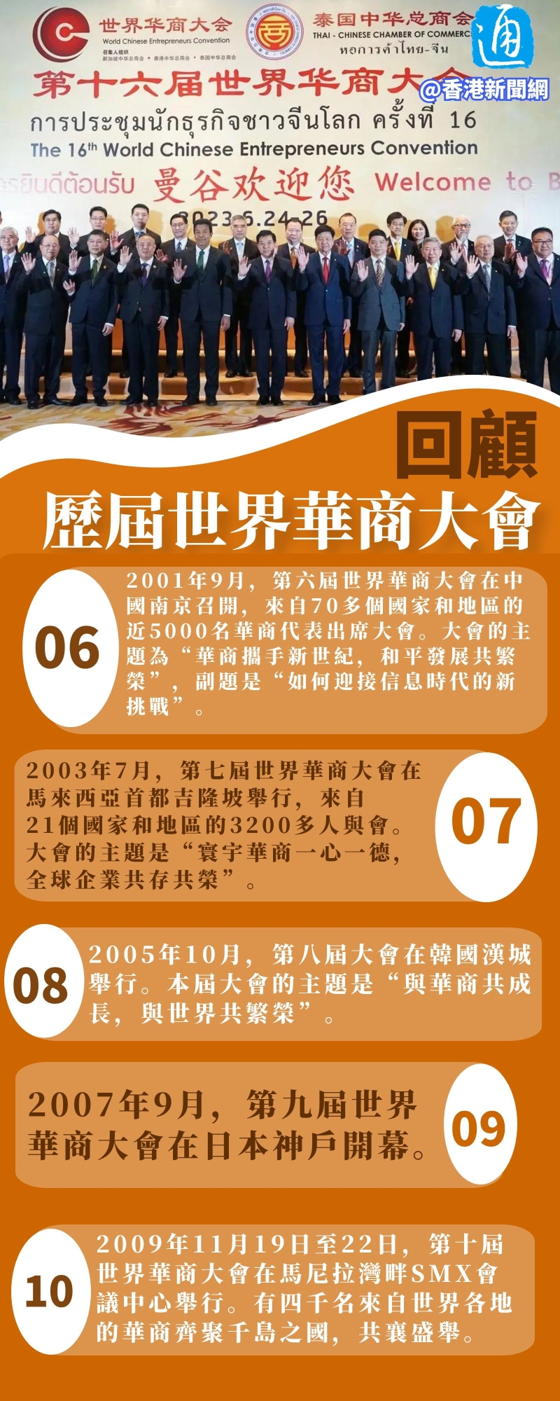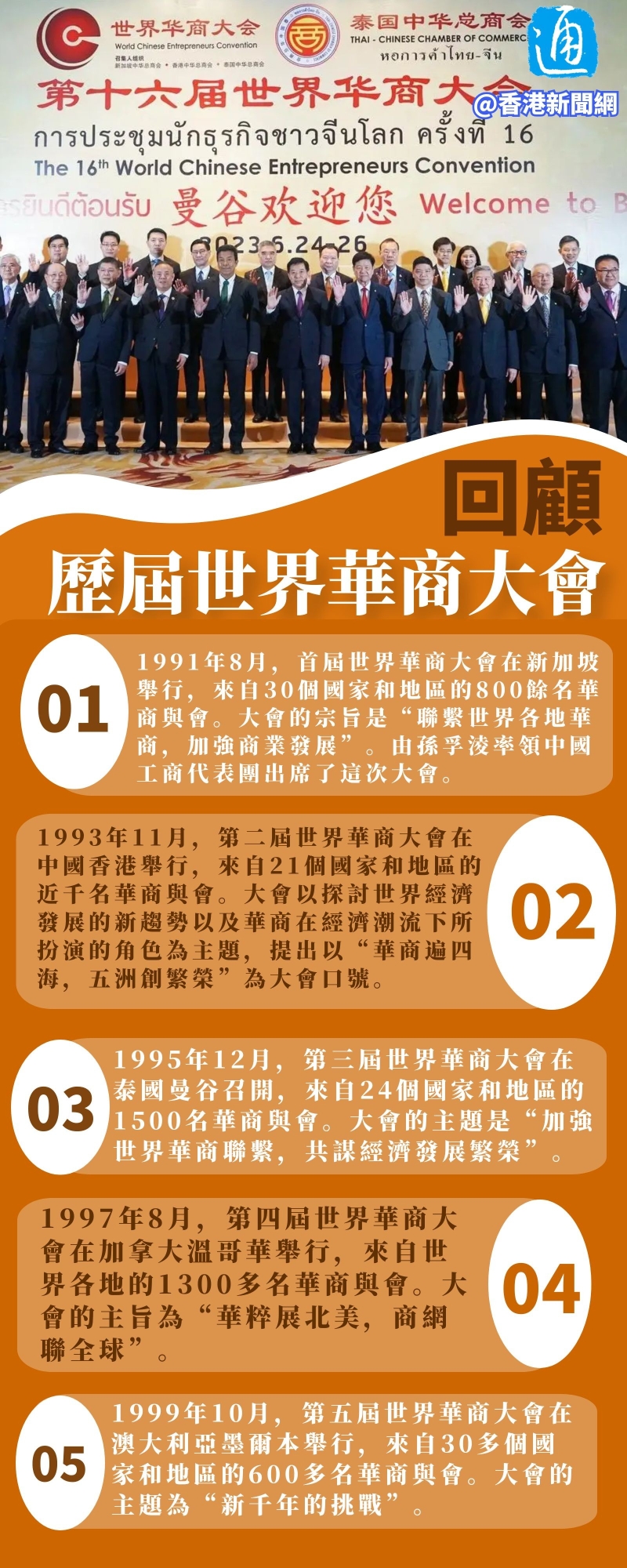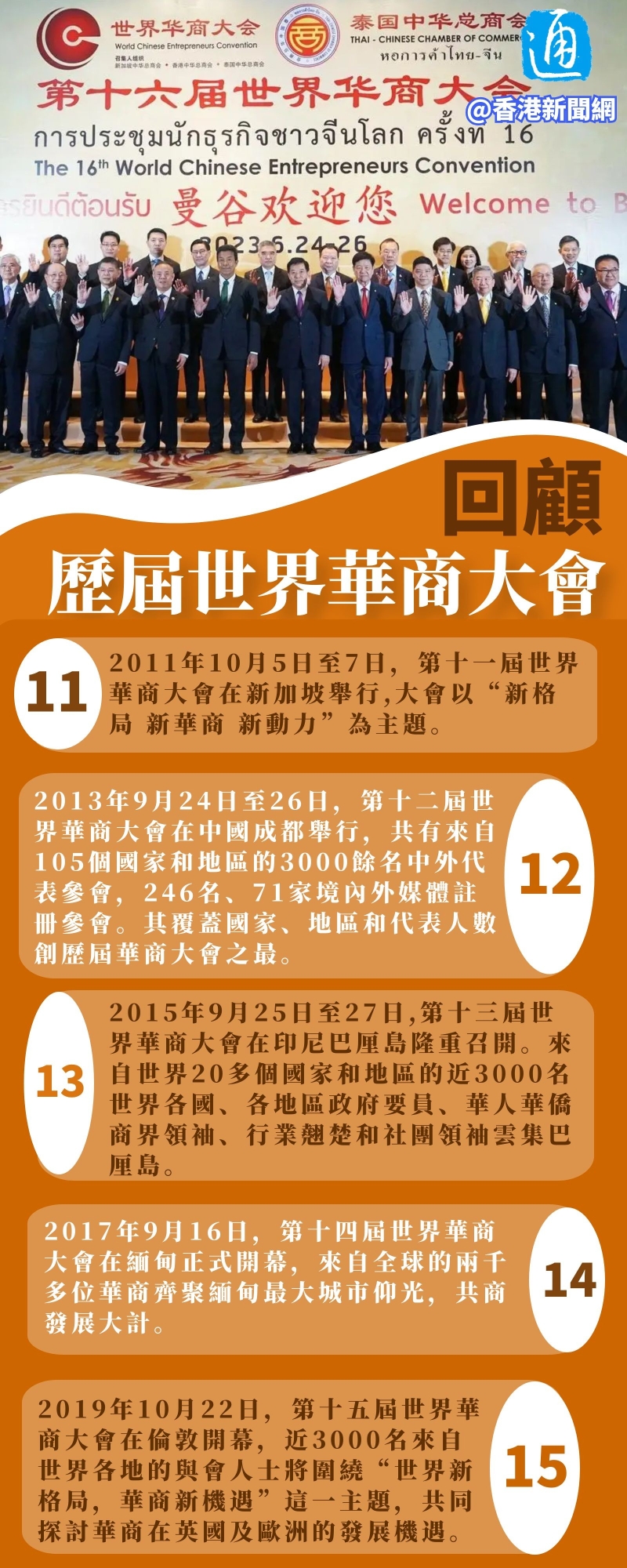 香港新聞網6月19日電 2023年2月22日,泰國中華總商會舉行新聞發布會宣布,由該會主辦、以“匯華商大智慧,譜華族新篇章”為主題的第16屆世界華商大會將於今年6月24日至26日在泰國曼谷舉行。 世界華商大會由新加坡中華總商會發起,大會的三大召集人組織包括新加坡中華總商會 、香港中華總商會 、泰國中華總商會。毎兩年一度的世界華商大會已舉辦15 屆。 十多年來,世界華商大會已成為世界各地華商促進經貿合作的紐帶和橋梁。同時,世界華商大會也有效促進了華人華商服務當地經濟,推動了所在國家和地區經濟的發展。 戳圖,了解歷年世界華商大會在哪裡舉辦及其精彩主題~